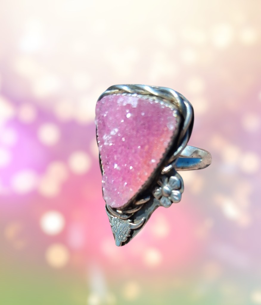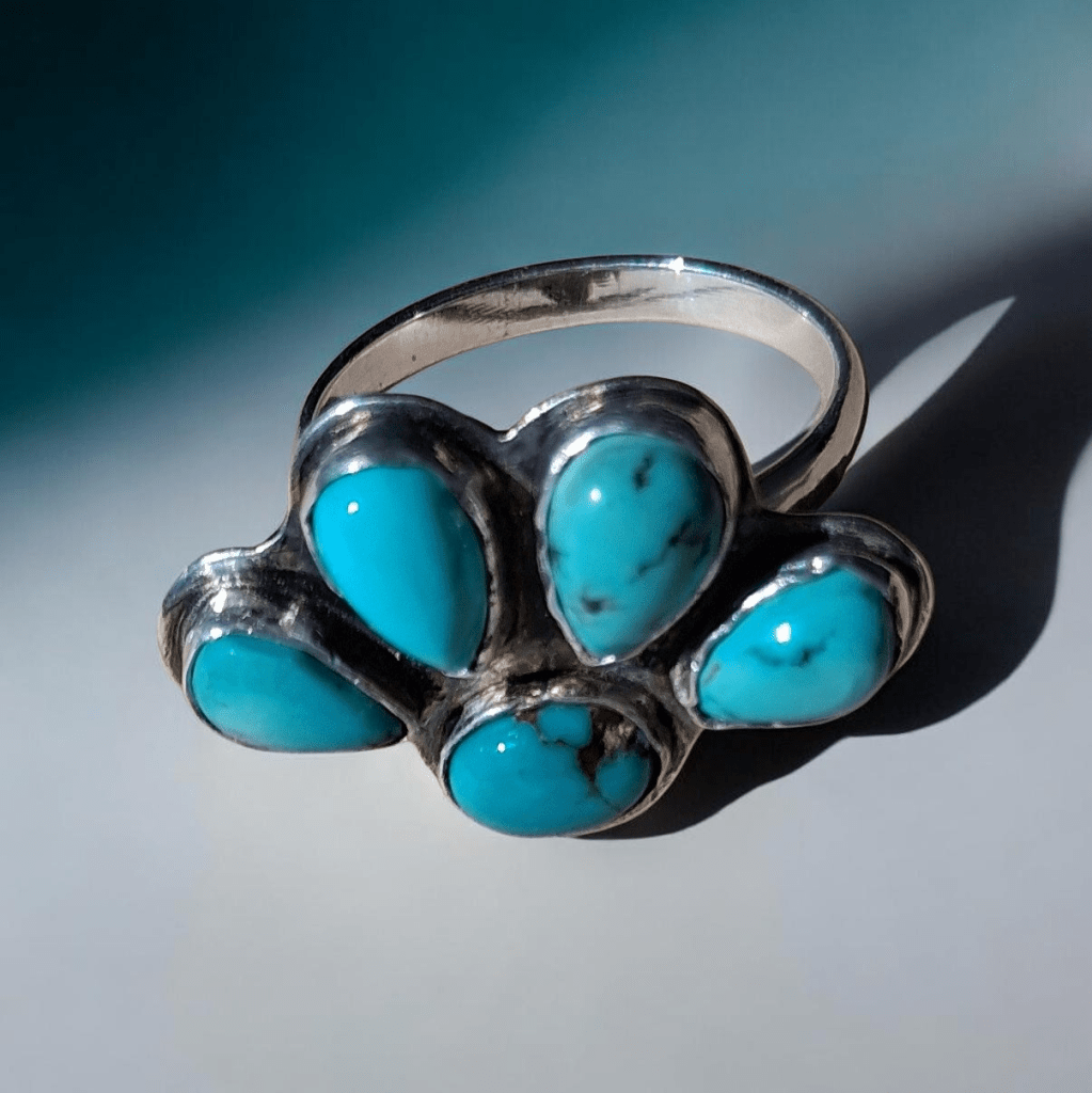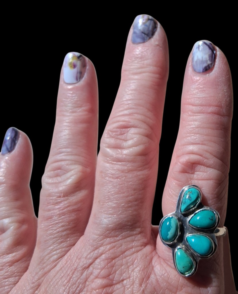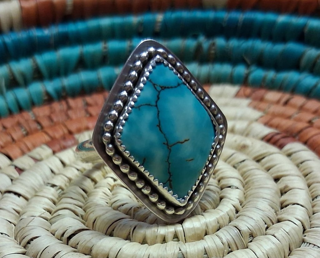 Turquoise stone set in sterling silver with beaded wrap, size 8.75, $178